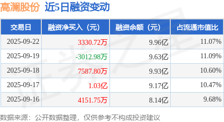 证券之星消息,9月22日,高澜股份(300499)融资买入2.86亿元,融资偿还2.53亿元,融资净买入3330.72万元,融资余额9.96亿元。