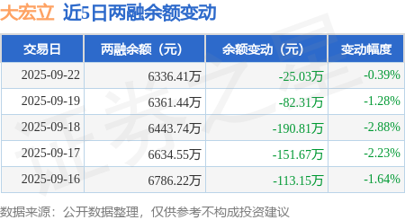 证券之星消息,9月22日,大宏立(300865)融资买入364.27万元,融资偿还389.3万元,融资净卖出25.03万元,融资余额6336.41万元。