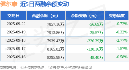 证券之星消息,9月22日,健尔康(603205)融资买入195.8万元,融资偿还252.49万元,融资净卖出56.69万元,融资余额7856.88万元。