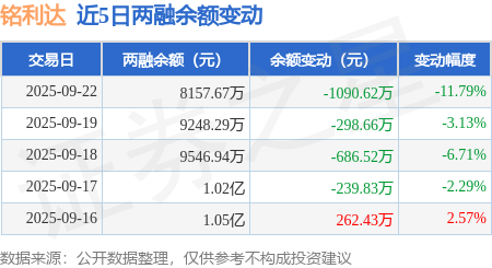 证券之星消息,9月22日,铭利达(301268)融资买入542.29万元,融资偿还1646.12万元,融资净卖出1103.83万元,融资余额8074.59万元。