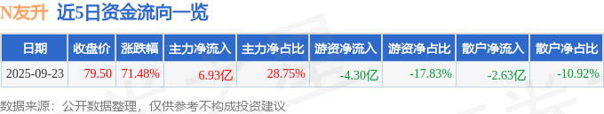 证券之星消息,截至2025年9月23日收盘,N友升(603418)报收于79.5元,上涨71.48%,换手率70.0%,成交量28.3万手,成交额24.12亿元。