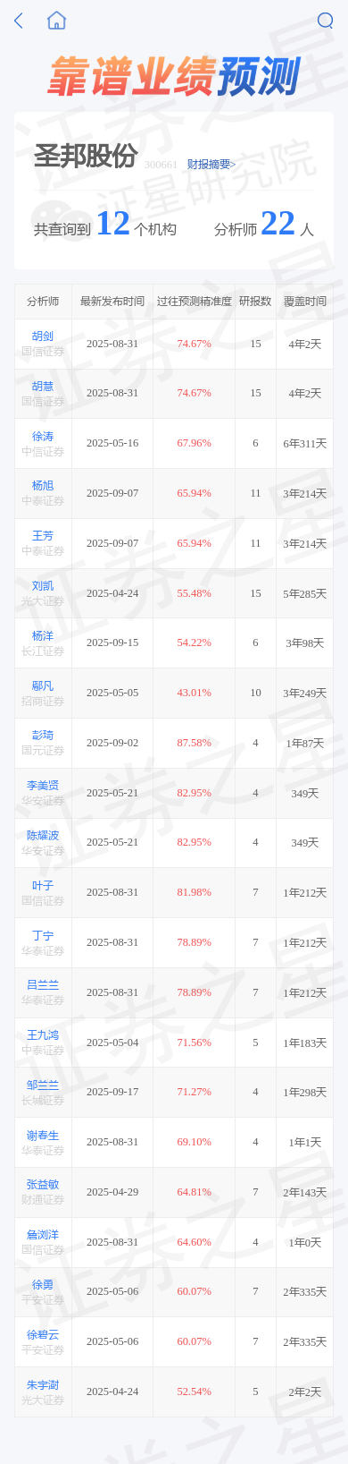 如果您对这家公司感兴趣,可以参考证星研究院统计的圣邦股份的分析师业绩预测数据,其中根据国信证券的分析师胡剑预测公司未来PE为46.0(更多特色估值数据尽在证星研究院,所有数据均来源公开资料,期且所有资料都存在一定时间滞后,所有相关数据均不可作为投资决策单一依据)。
