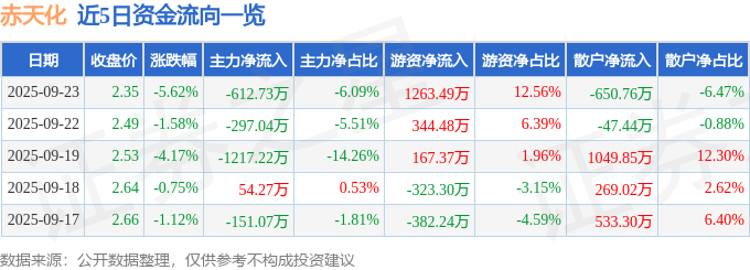 证券之星消息,截至2025年9月23日收盘,赤天化(600227)报收于2.35元,下跌5.62%,换手率3.33%,成交量42.54万手,成交额1.01亿元。