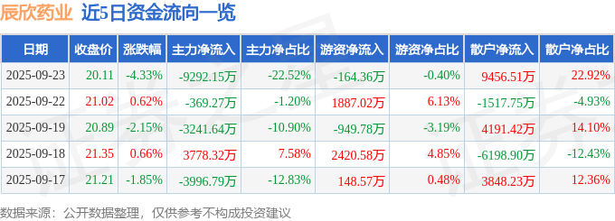 证券之星消息,截至2025年9月23日收盘,辰欣药业(603367)报收于20.11元,下跌4.33%,换手率4.53%,成交量20.5万手,成交额4.13亿元。