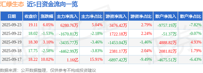 证券之星消息,截至2025年9月23日收盘,汇绿生态(001267)报收于19.11元,上涨6.05%,换手率11.91%,成交量68.57万手,成交额12.47亿元。