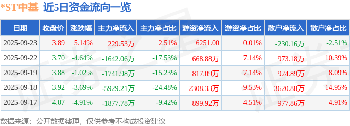 证券之星消息,截至2025年9月23日收盘,*ST中基(000972)报收于3.89元,上涨5.14%,换手率3.07%,成交量23.68万手,成交额9160.85万元。
