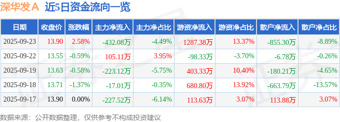 证券之星消息,截至2025年9月23日收盘,深华发A(000020)报收于13.9元,上涨2.58%,换手率3.94%,成交量7.14万手,成交额9626.33万元。