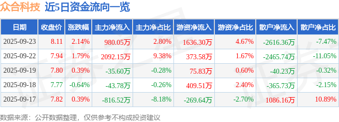 证券之星消息,截至2025年9月23日收盘,众合科技(000925)报收于8.11元,上涨2.14%,换手率6.51%,成交量43.8万手,成交额3.5亿元。
