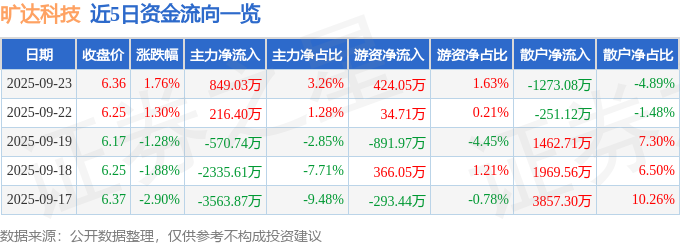 证券之星消息,截至2025年9月23日收盘,旷达科技(002516)报收于6.36元,上涨1.76%,换手率2.85%,成交量41.59万手,成交额2.6亿元。