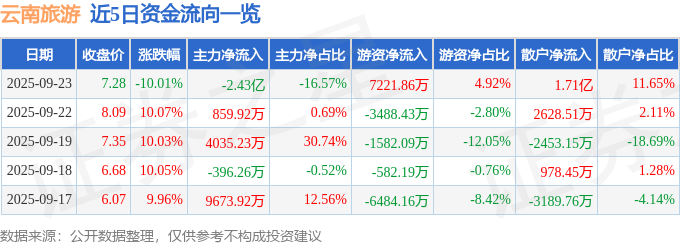 证券之星消息,截至2025年9月23日收盘,云南旅游(002059)报收于7.28元,下跌10.01%,跌停,换手率20.15%,成交量198.05万手,成交额14.69亿元。
