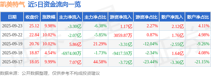 9月23日的资金流向数据方面,主力资金净流出3.3亿元,占总成交额6.38%,游资资金净流入1.17亿元,占总成交额2.27%,散户资金净流入2.12亿元,占总成交额4.11%。