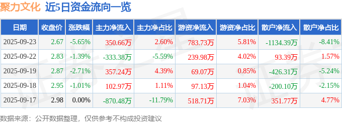 证券之星消息,截至2025年9月23日收盘,聚力文化(002247)报收于2.67元,下跌5.65%,换手率7.87%,成交量50.66万手,成交额1.35亿元。