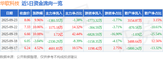 证券之星消息,华软科技9月23日涨停收盘,收盘价8.06元。该股于9点25分涨停,2次打开涨停,截止收盘封单资金为1.71亿元,占其流通市值3.45%。
