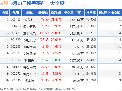 当日A股换手率前10大个股中9只个股收涨,平均涨幅17.62%,其中N友升(603418)以换手率70.0%排第一,6只个股近5个交易日中多次上榜。