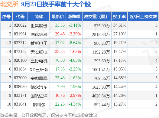 当日北交所换手率前10大个股中3只个股收涨,平均涨幅5.66%,其中世昌股份(920022)以换手率34.61%排第一,8只个股近5个交易日中多次上榜。