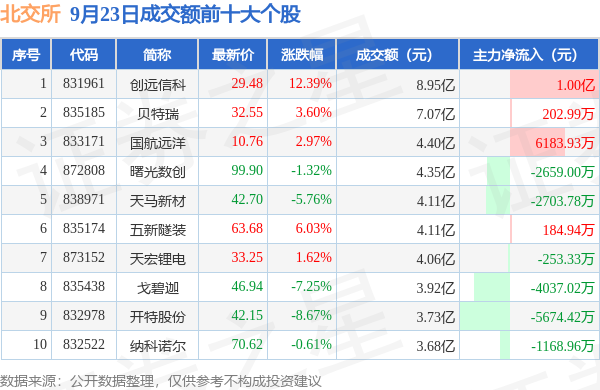 当日北交所成交额前10大个股中5只个股收涨,平均涨幅5.32%,其中创远信科(831961)以成交额8.95亿元排第一。从主力资金流入看,成交额前10大个股中有4只个股呈现主力资金净流入。