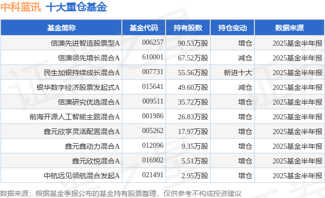 根据2025基金半年报公募基金重仓股数据,重仓该股的公募基金共12家,其中持有数量最多的公募基金为信达澳亚基金的信澳先进智造股票型A。信澳先进智造股票型A目前规模为13.65亿元,最新净值2.4425(9月22日),较上一交易日上涨5.89%,近一年上涨131.71%。该公募基金现任基金经理为齐兴方。齐兴方在任的基金产品包括:信澳领先增长混合A,管理时间为2021年12月17日至今,期间收益率为-3.9%;