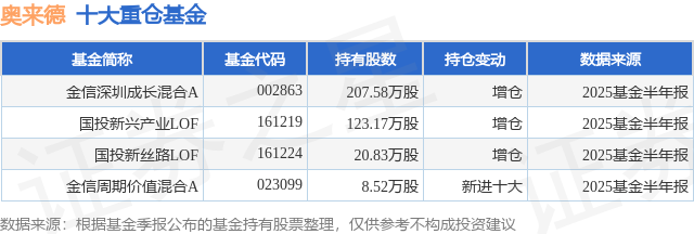 根据2025基金半年报公募基金重仓股数据,重仓该股的公募基金共4家,其中持有数量最多的公募基金为金信基金的金信深圳成长混合A。金信深圳成长混合A目前规模为6.64亿元,最新净值2.8903(9月22日),较上一交易日上涨0.36%,近一年上涨109.11%。该公募基金现任基金经理为黄飙 杨超。黄飙在任的基金产品包括:金信优质成长混合A,管理时间为2023年4月12日至今,期间收益率为64.43%;金信周期价值混合A,管理时间为2025年2月20日至今,期间收益率为39.71%;金信转型创新成长混合发起式A,管理时间为2025年5月17日至今,期间收益率为23.5%。杨超在任的基金产品包括:金信转型创新成长混合发起式A,管理时间为2022年1月19日至今,期间收益率为67.48%;金信消费升级股票A,管理时间为2022年8月16日至今,期间收益率为-8.24%;金信景气优选混合A,管理时间为2023年11月2日至今,期间收益率为23.5%;金信智能中国2025混合A,管理时间为2025年4月3日至今,期间收益率为6.12%。