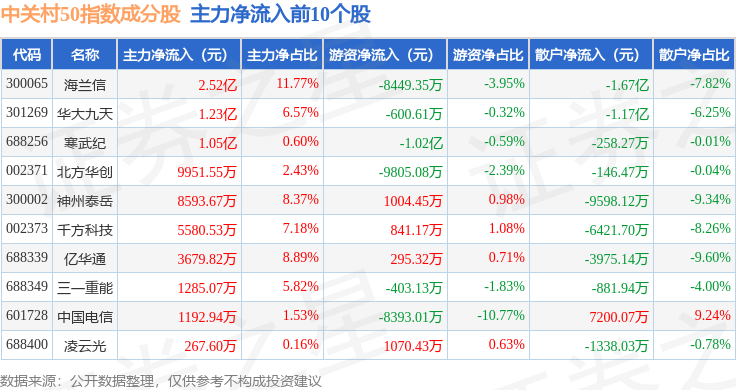 资金流向方面,中关村50(399423)指数成份股当日主力资金净流出合计21.54亿元,游资资金净流入合计4.64亿元,散户资金净流入合计16.9亿元。成份股资金流向详情见下表: