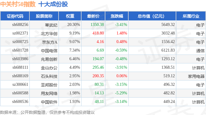 中关村50(399423)指数十大成份股详情如下: