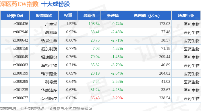 深医药EW(399676)指数十大成份股详情如下: