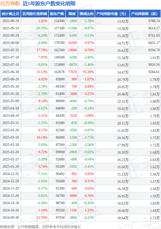 从股价来看,2025年9月10日至2025年9月19日,北方导航区间涨幅为2.82%,在此期间股东户数减少2800.0户,减幅为1.78%。