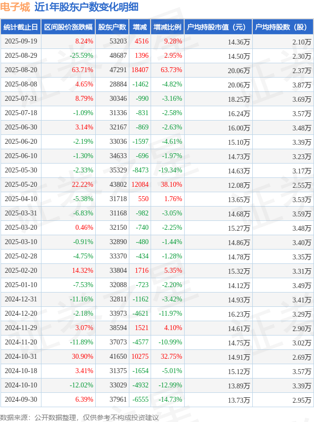 从股价来看,2025年8月29日至2025年9月19日,电子城区间涨幅为8.24%,在此期间股东户数增加4516.0户,增幅为9.28%。