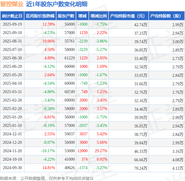 从股价来看,2025年9月10日至2025年9月19日,晋控煤业区间涨幅为12.78%,在此期间股东户数减少1000.0户,减幅为1.75%。