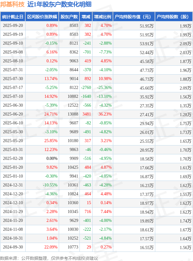 从股价来看,2025年9月10日至2025年9月20日,邦基科技区间涨幅为0.89%,在此期间股东户数增加382.0户,增幅为4.7%。