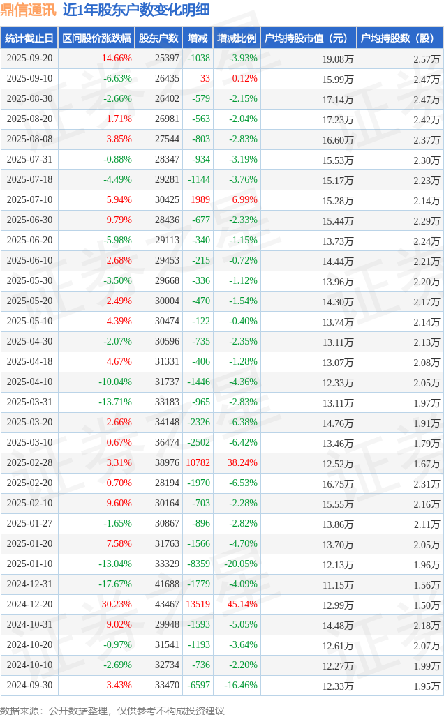 从股价来看,2025年9月10日至2025年9月20日,鼎信通讯区间涨幅为14.66%,在此期间股东户数减少1038.0户,减幅为3.93%。