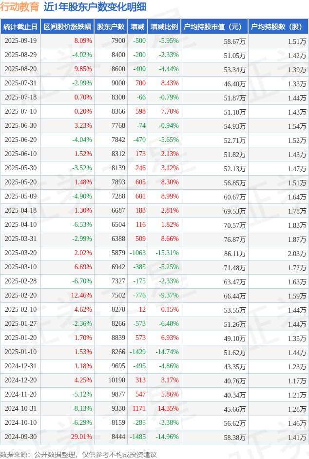 证券之星消息,近日行动教育披露,截至2025年9月19日公司股东户数为7900.0户,较8月29日减少500.0户,减幅为5.95%。户均持股数量由上期的1.42万股增加至1.51万股,户均持股市值为58.67万元。