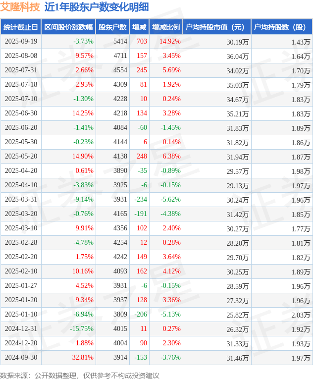 从股价来看,2025年8月8日至2025年9月19日,艾隆科技区间跌幅为3.73%,在此期间股东户数增加703.0户,增幅为14.92%。