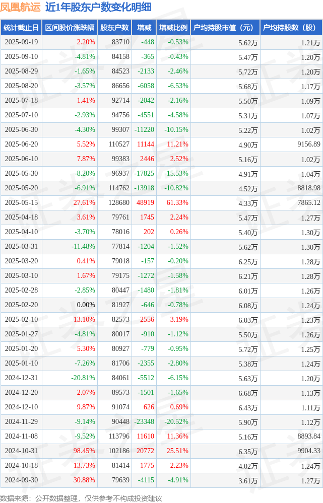 从股价来看,2025年9月10日至2025年9月19日,凤凰航运区间涨幅为2.2%,在此期间股东户数减少448.0户,减幅为0.53%。