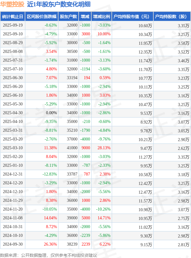 从股价来看,2025年9月10日至2025年9月19日,华塑控股区间跌幅为0.63%,在此期间股东户数减少1000.0户,减幅为3.03%。