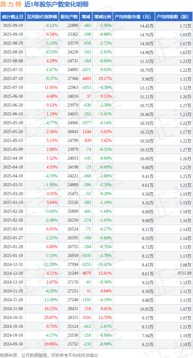 证券之星消息,近日英 力 特披露,截至2025年9月19日公司股东户数为2.29万户,较9月10日减少482.0户,减幅为2.06%。户均持股数量由上期的1.69万股增加至1.72万股,户均持股市值为14.45万元。