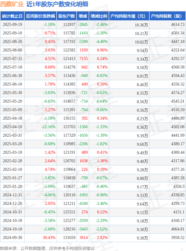 从股价来看,2025年9月10日至2025年9月19日,西藏矿业区间跌幅为1.1%,在此期间股东户数减少2845.0户,减幅为2.46%。