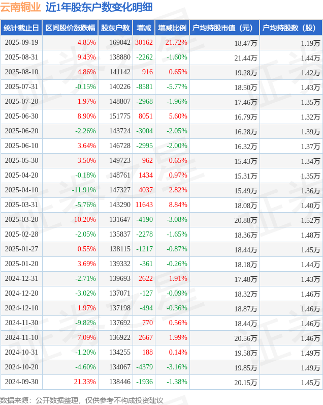 从股价来看,2025年8月31日至2025年9月19日,云南铜业区间涨幅为4.85%,在此期间股东户数增加3.02万户,增幅为21.72%。