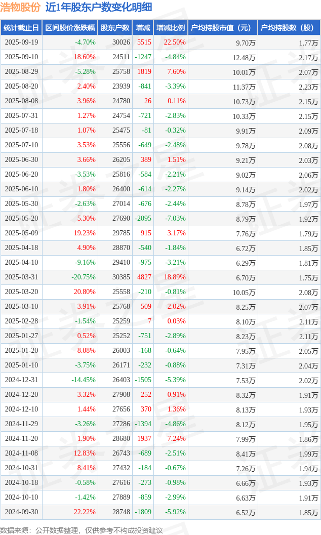 从股价来看,2025年9月10日至2025年9月19日,浩物股份区间跌幅为4.7%,在此期间股东户数增加5515.0户,增幅为22.5%。