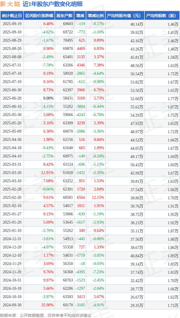 从股价来看,2025年9月10日至2025年9月19日,新 大 陆区间涨幅为0.4%,在此期间股东户数减少119.0户,减幅为0.17%。