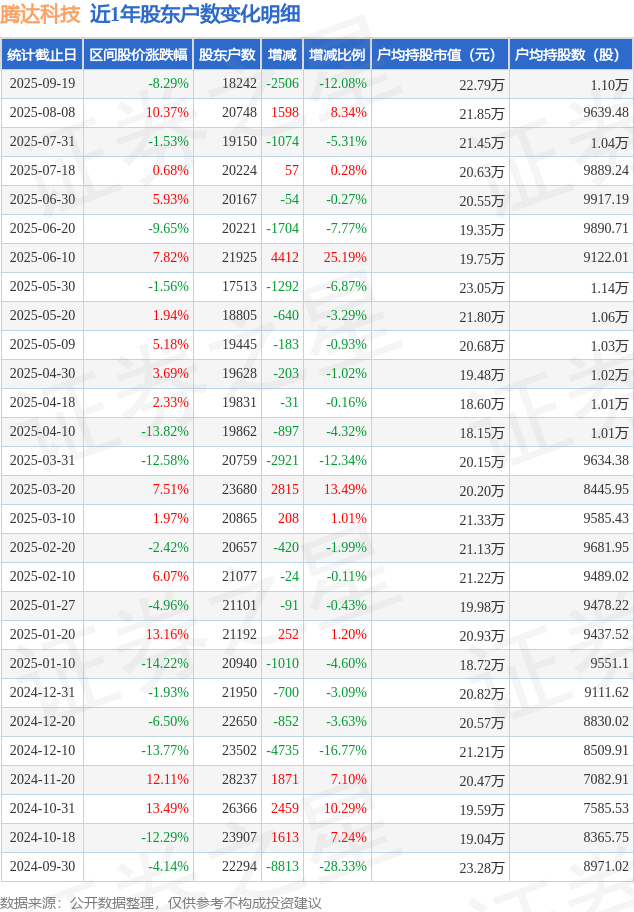 从股价来看,2025年8月8日至2025年9月19日,腾达科技区间跌幅为8.29%,在此期间股东户数减少2506.0户,减幅为12.08%。
