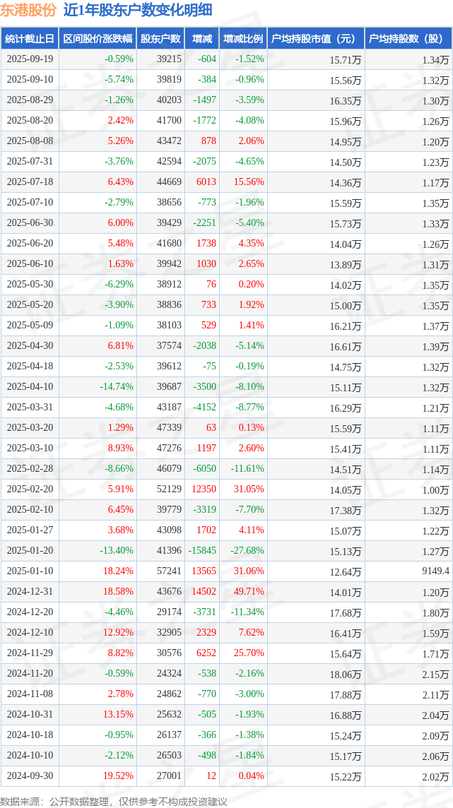 从股价来看,2025年9月10日至2025年9月19日,东港股份区间跌幅为0.59%,在此期间股东户数减少604.0户,减幅为1.52%。
