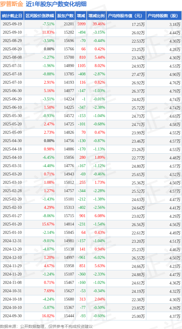 从股价来看,2025年9月10日至2025年9月19日,罗普斯金区间跌幅为7.51%,在此期间股东户数增加5999.0户,增幅为39.46%。