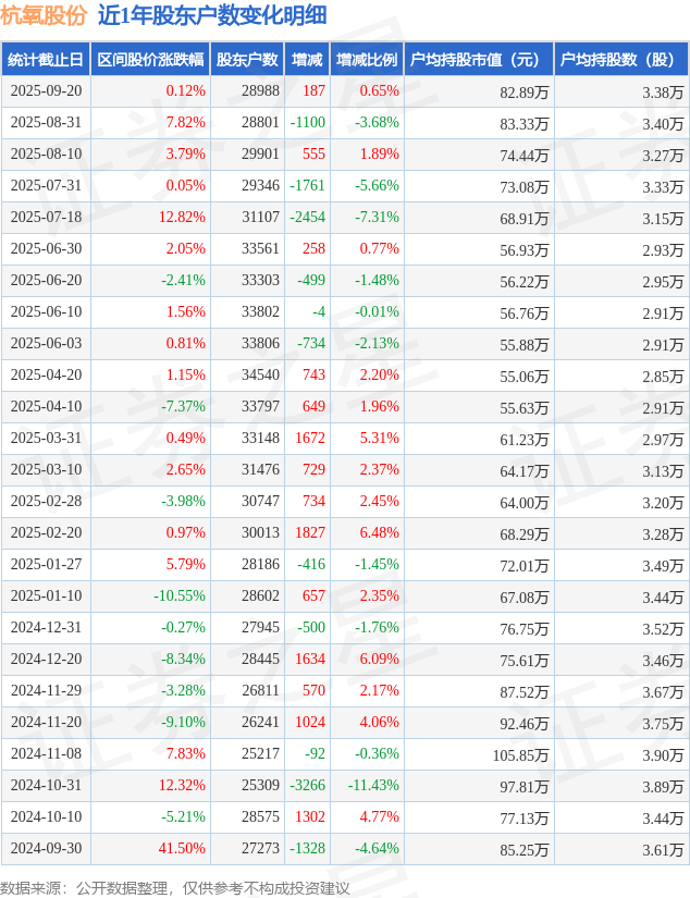 从股价来看,2025年8月31日至2025年9月20日,杭氧股份区间涨幅为0.12%,在此期间股东户数增加187.0户,增幅为0.65%。