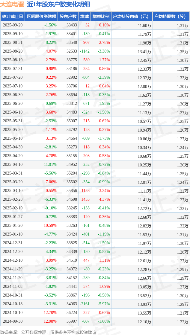 从股价来看,2025年9月10日至2025年9月20日,大连电瓷区间跌幅为1.56%,在此期间股东户数增加32.0户,增幅为0.1%。