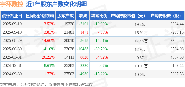 从股价来看,2025年9月10日至2025年9月19日,宇环数控区间涨幅为3.52%,在此期间股东户数减少2161.0户,减幅为10.06%。