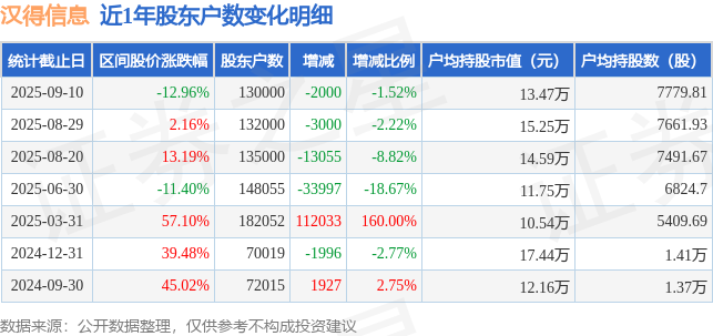 从股价来看,2025年8月29日至2025年9月10日,汉得信息区间跌幅为12.96%,在此期间股东户数减少2000.0户,减幅为1.52%。