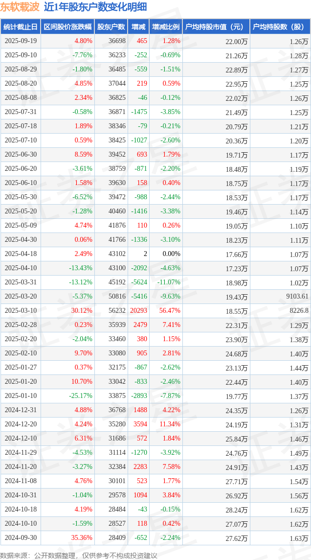 从股价来看,2025年9月10日至2025年9月19日,东软载波区间涨幅为4.8%,在此期间股东户数增加465.0户,增幅为1.28%。