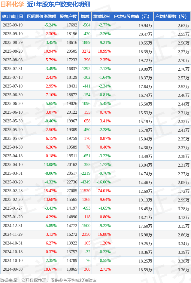 从股价来看,2025年9月10日至2025年9月19日,日科化学区间跌幅为5.24%,在此期间股东户数减少504.0户,减幅为2.77%。