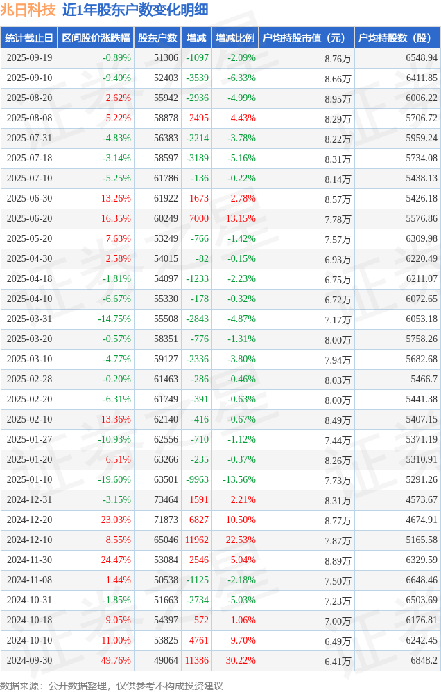 从股价来看,2025年9月10日至2025年9月19日,兆日科技区间跌幅为0.89%,在此期间股东户数减少1097.0户,减幅为2.09%。