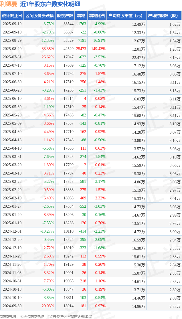 从股价来看,2025年9月10日至2025年9月19日,利德曼区间跌幅为3.75%,在此期间股东户数减少1763.0户,减幅为4.99%。
